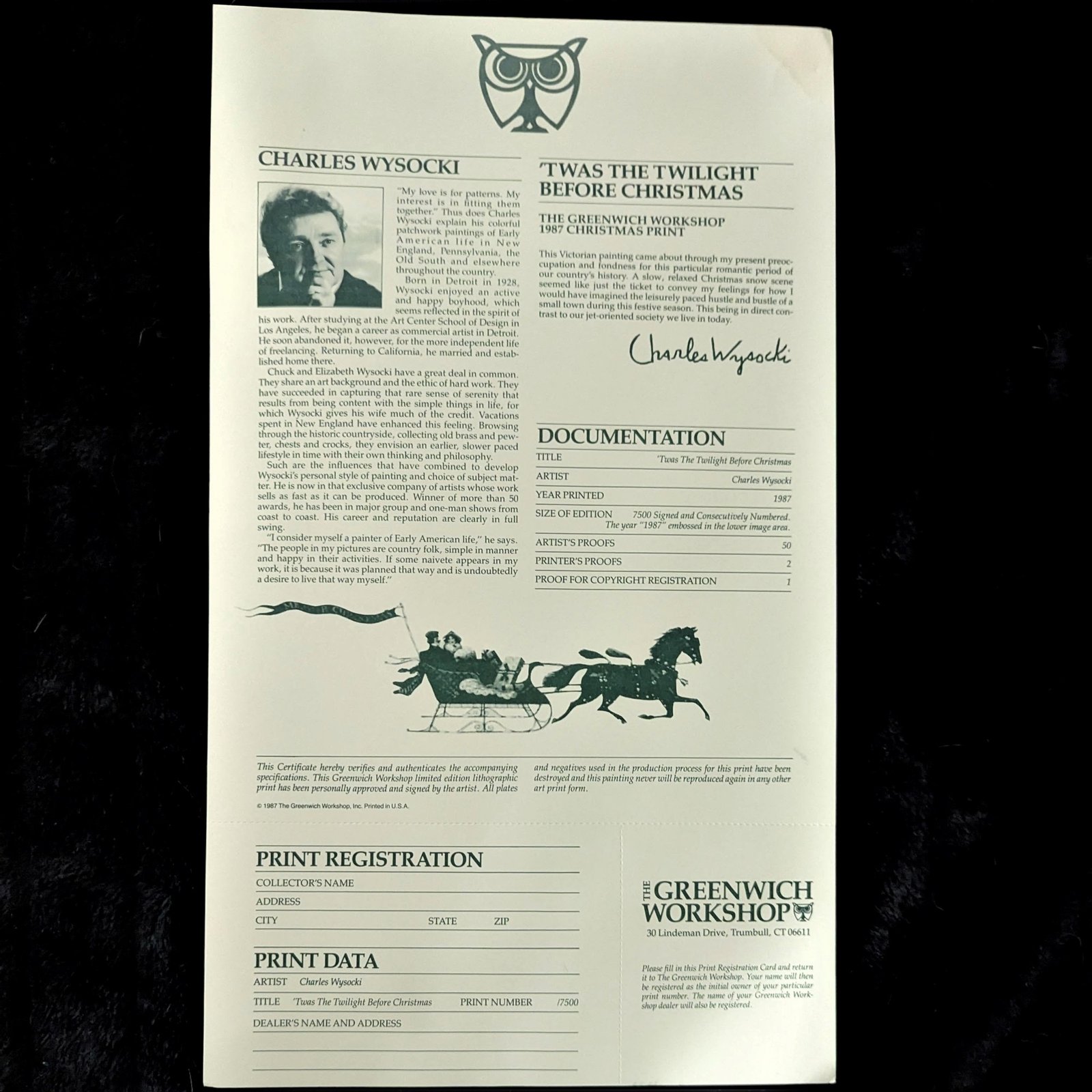 C. Wysocki ‘Twas The Twilight Before Christmas’ print is a picture perfect of a dreamy Victorian country Christmas.Wysocki’s work features his love of the Victorian Era Christmas with its relaxing scenes of people enjoying themselves. This print comes from the Greenwich Workshop in Trumbell, CT in 1987. This one is  number is 5856/7500 of signed prints.