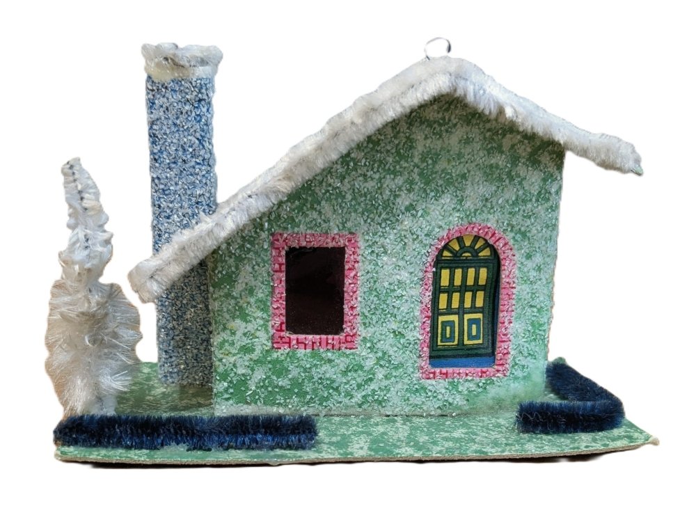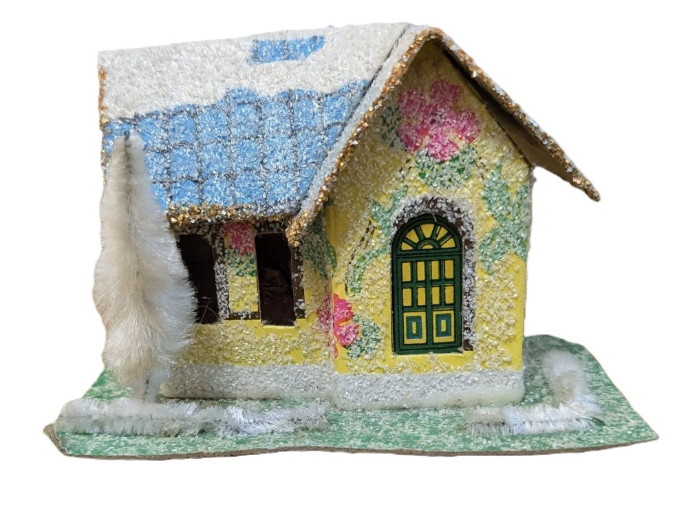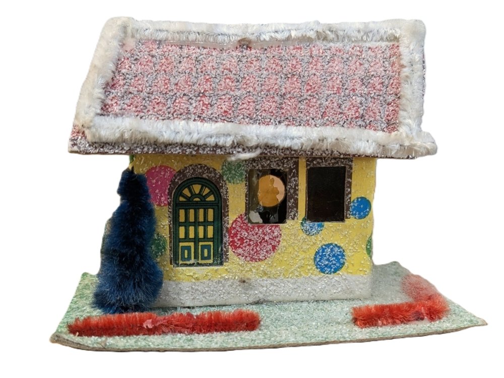 These Putz houses originated as part of post-WWII holiday exports from Japan and were commonly used in early American Christmas displays, mantel villages, and beneath Christmas trees alongside vintage train sets. Collectors love their nostalgic charm and the whimsical irregularities that come from handmade production.