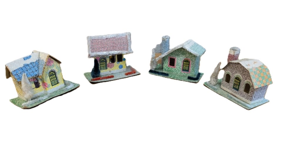 Set of four vintage 1950s Japanese Putz cardboard Christmas houses with original snow flocking, mica glitter, and window film — charming mid-century holiday village décor.