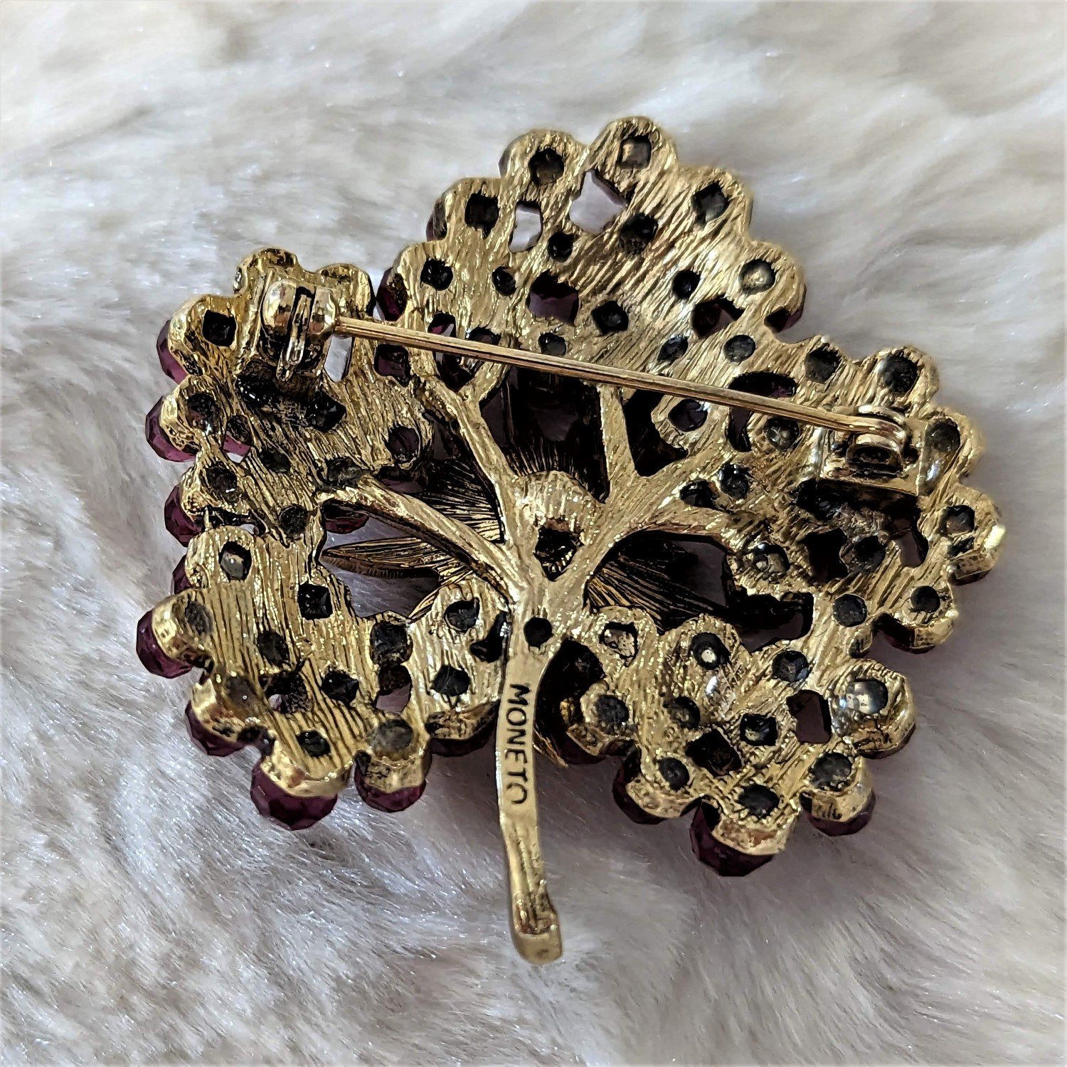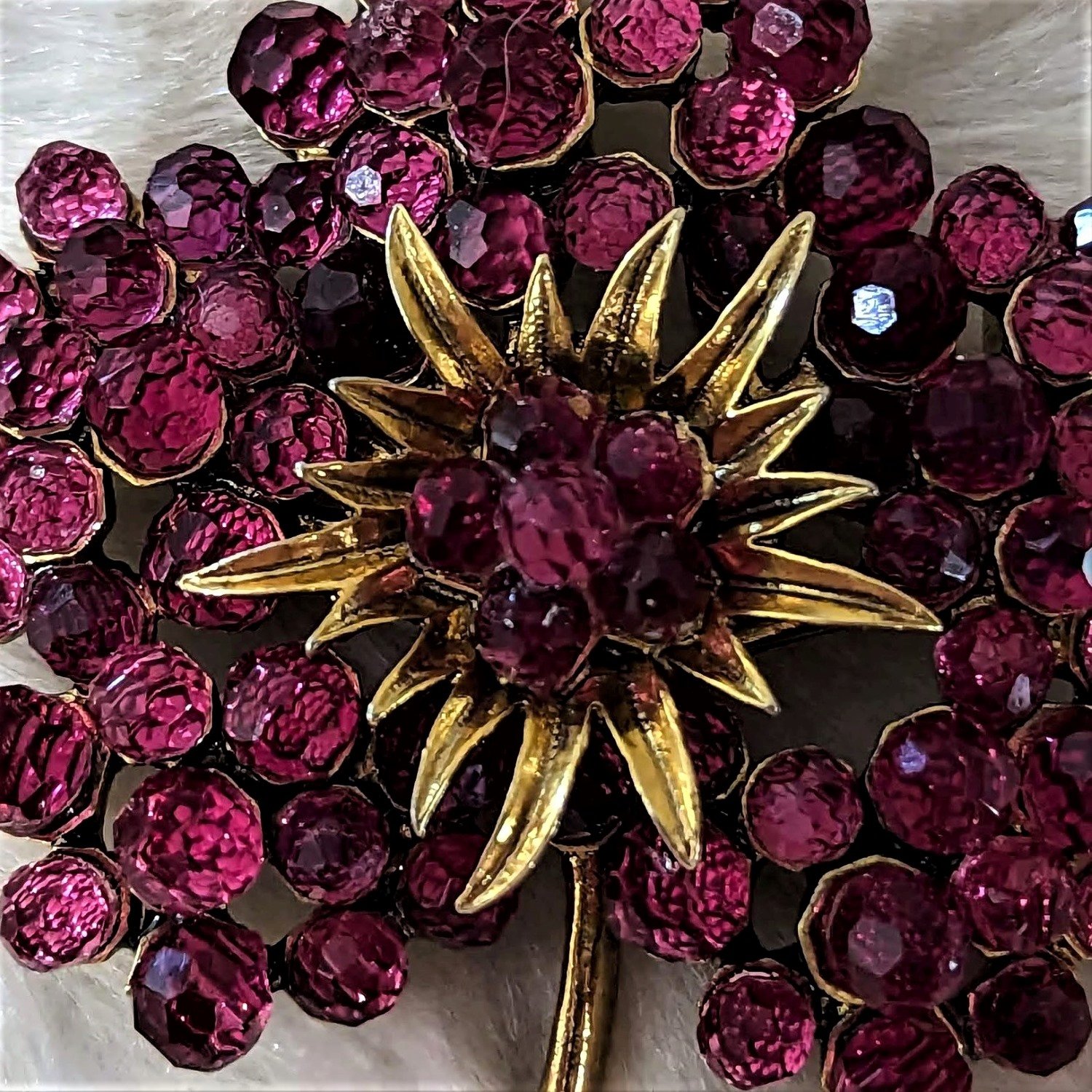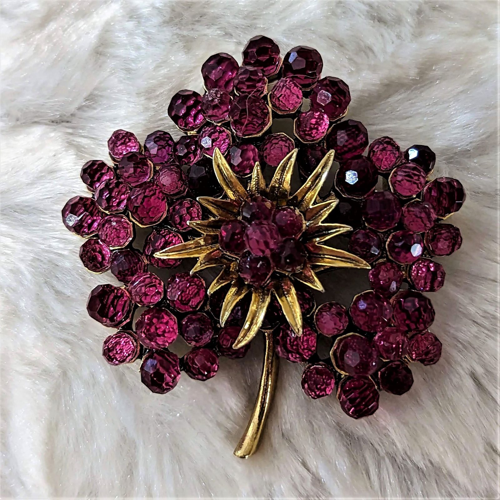 Monet Round Pink Crystals Brooch is so delicate and quite a beautiful piece. It features a center of five crystals  surrounded by gold tone leaves. The five leaf brooch has five section with ten crystals each. All together there are 55 round dark pink crystals of two sizes.