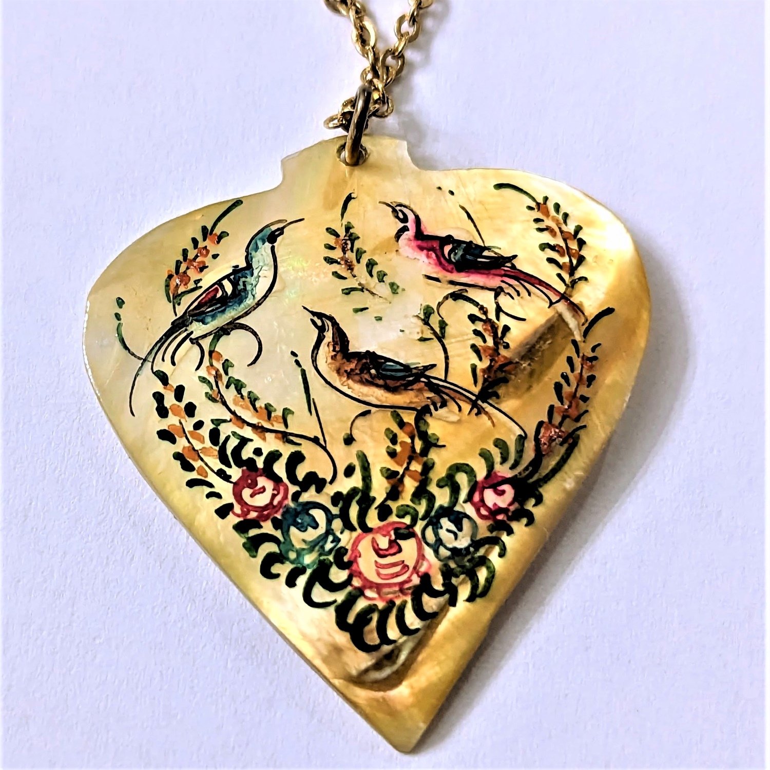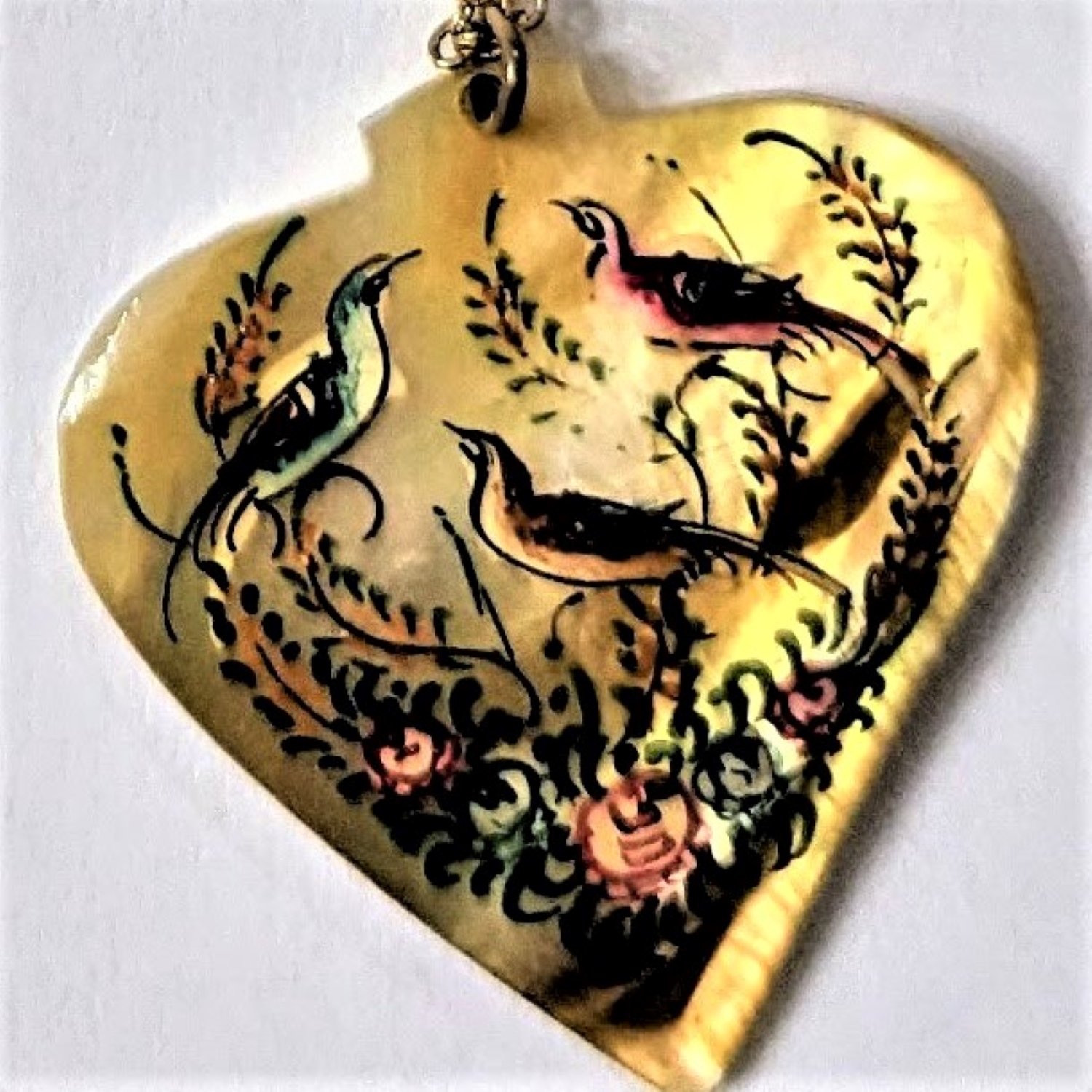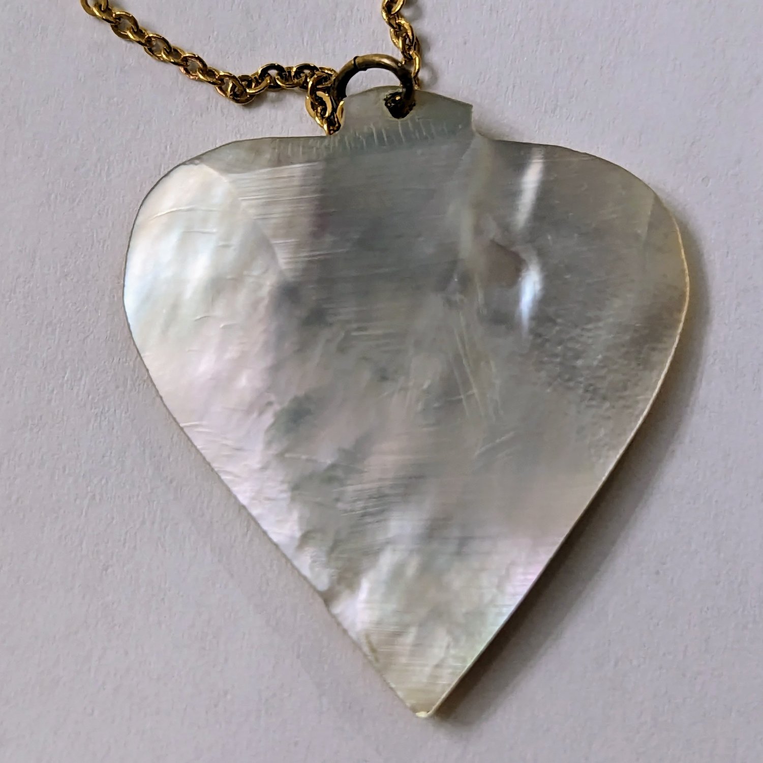 This Mother-of-Pearl Painted Heart Pendant is a thing of beauty. This is a piece of mother-of-pearl shell carved into a heart shape.