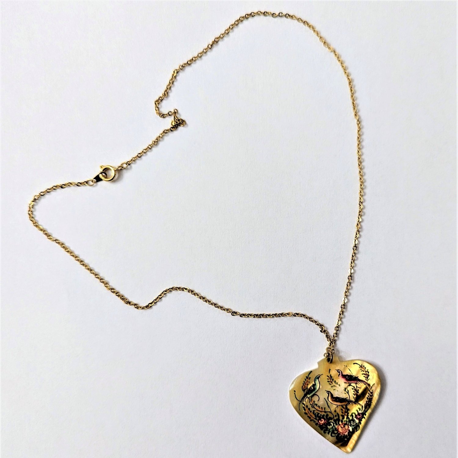 It is hand painted with delicate birds, flowers, and leaves in a fabulous design. This is a vintage piece from the 1930s-1940s and is in like new condition. It measures 1 3/8″ x 1 1/2″. The pendant comes with a 16″ gold color chain.