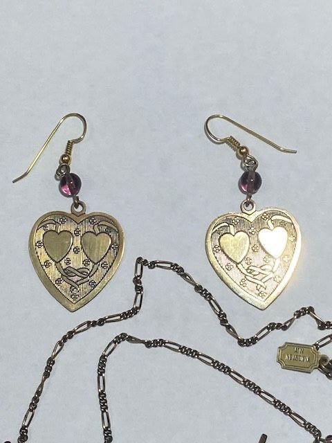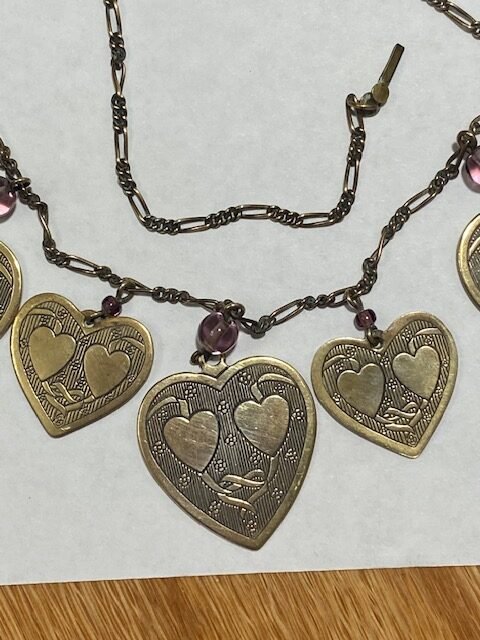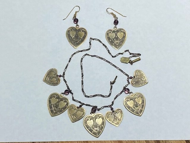 Pididdly Links Brass Hearts Jewelry Set is a 1980s vintage creation of Pididdly Links. This 1970s company made Art Nouveau style jewelry until 1996. This wonderful jewelry set features a necklace of eight brass hearts that have a double hearts and ribbon design to signify romance. The necklace comes with matching double heart and ribbon design pierced earring. Both pieces also have small light purple glass beads for special accent.