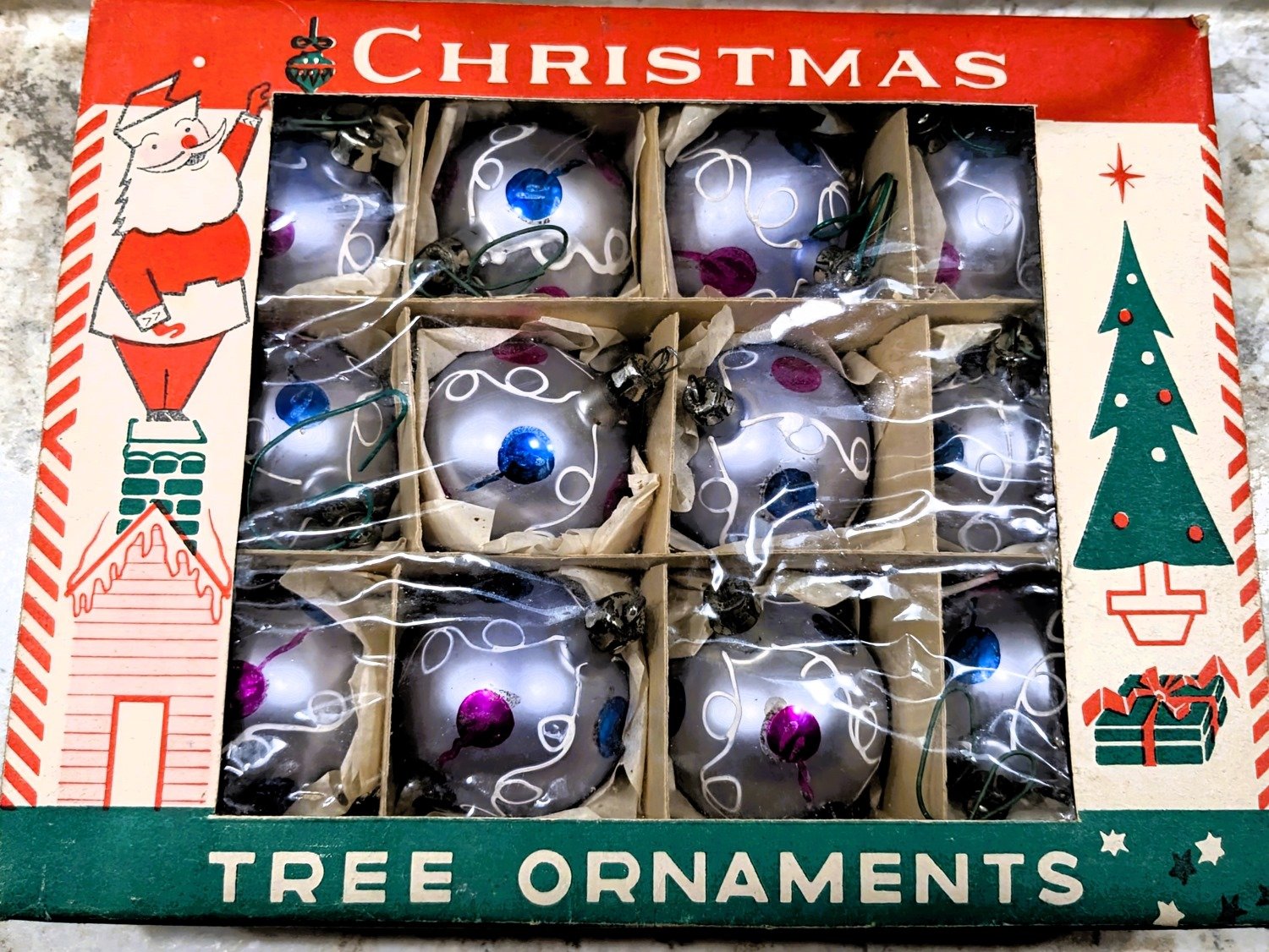 Form Old School glass craftsmen, the ornaments are hand blown glass and hand painted by experts. All painting looks “almost new”. The only thing that gives their age away is the tarnished metal tops.